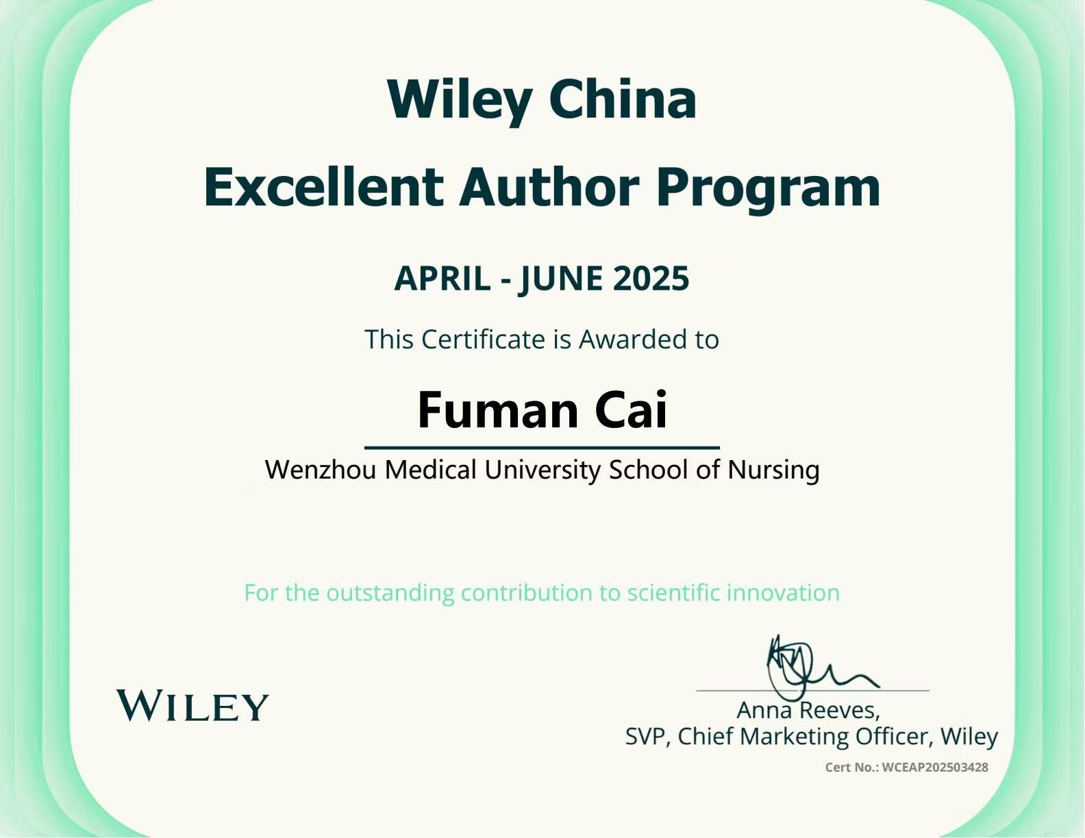 “威立Wiley中国高贡献作者奖”是为响应中国《国家“十五五”人才发展规划》中提出的创新驱动战略,深化与中国科研界的合作,支持基础研究与科技创新的全球化发展,威立Wiley统计了较受中国作者认可的Wiley期刊中由中国作者(通讯作者发文机构为中国大陆机构)发表后三个月内的所有文章全文阅读下载量,并从每本期刊中选择下载量最高的若干篇由中国作者所发表的文章,授予所有所在机构为中国大陆的中国作者“Wiley威立中国高贡献作者”,以感谢作者为科技进步做出的巨大贡献。