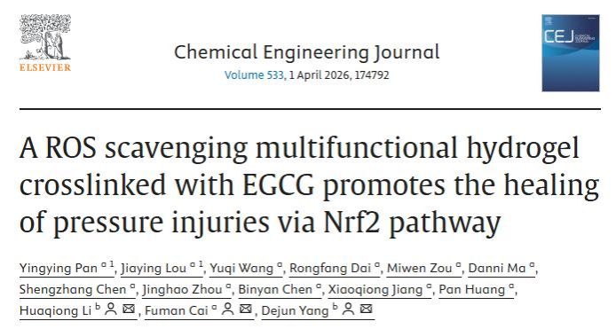 近日,av在线看-熟女av-色色视频 慢性伤口护理团队在国际权威期刊《Chemical Engineering Journal》(IF=13.2,中科院一区TOP)在线发表题为“A ROS scavenging multifunctional hydrogel crosslinked with EGCG promotes the healing of pressure injuries via Nrf2 pathway”的研究论文。该研究开发了一种以天然抗氧化剂EGCG为交联剂的多功能水凝胶,通过清除活性氧并调控Nrf2信号通路,为压力性损伤的慢性伤口护理干预提供了新的策略。