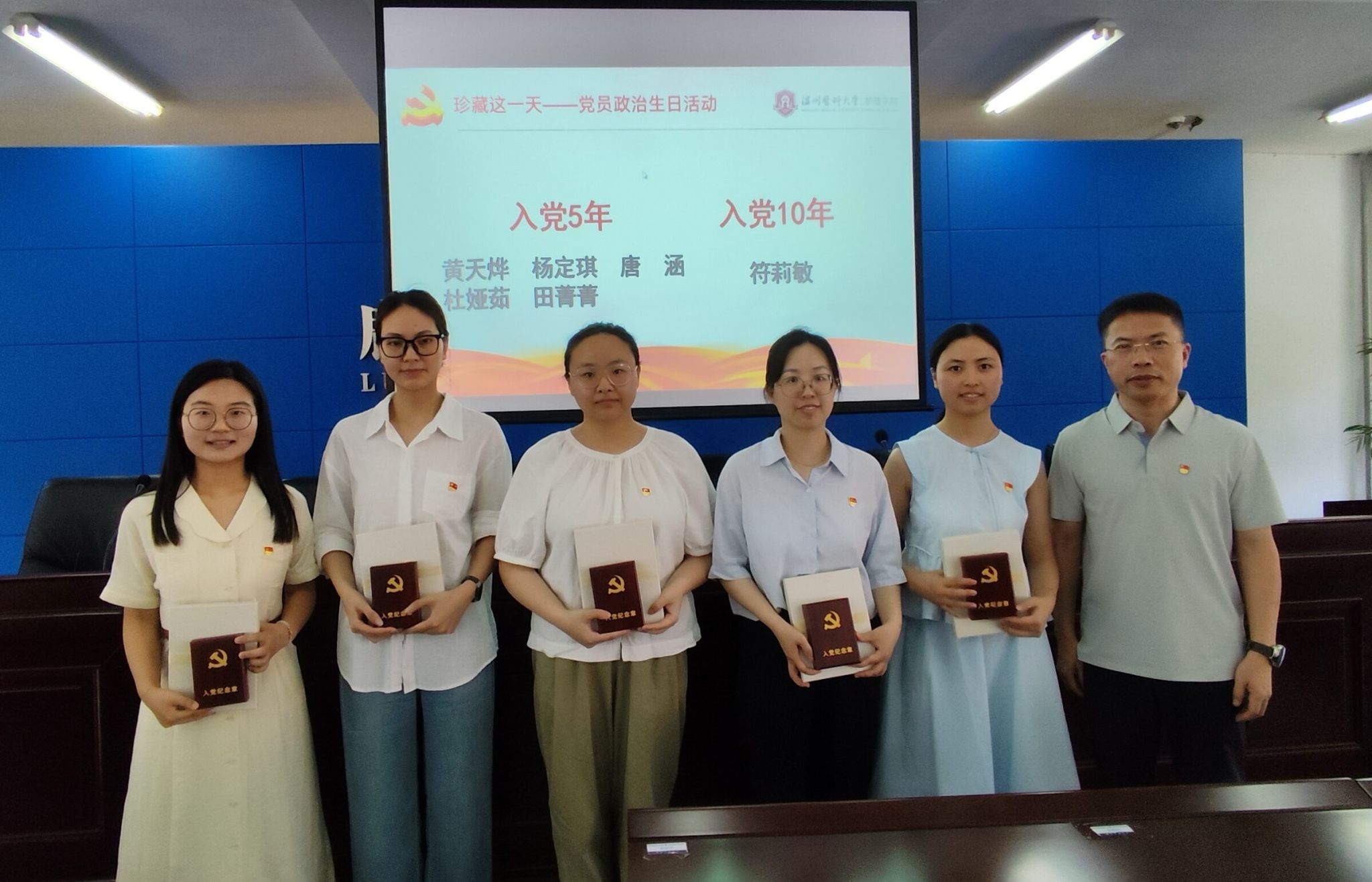 参观结束后,av在线看 党委举行了简朴而庄重的党员“政治生日”仪式。蔡福满院长为入党5周年的黄天烨、杨定琪、唐涵、杜娅茹、田菁菁老师,以及入党10周年的符莉敏老师颁发纪念章。王敏书记为入党15周年的黄盼、刘艳佳老师,以及入党20周年的涂海霞、朱莲莲老师颁发纪念章。