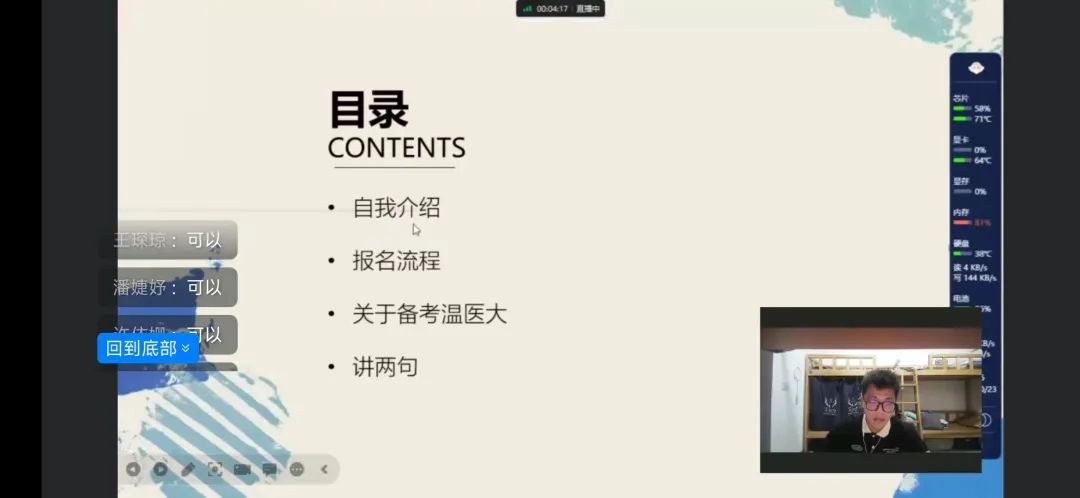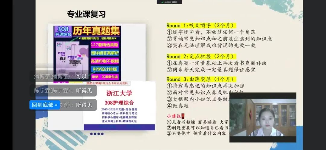 王婧学姐从如何处理实习和考研的关系出发,并介绍了报考流程,主要包括考生常见问题和填写报名信息应注意的问题。此外,学姐重点介绍了天津医科大学考研专业、招生和复习方法,并解答了同学们关心的跨考、就业方向和av在线看 选择等方面的问题。最后,学姐还强调了临近考试要关注当地疫情政策,可以通过申请借考免去隔离带来的不便。