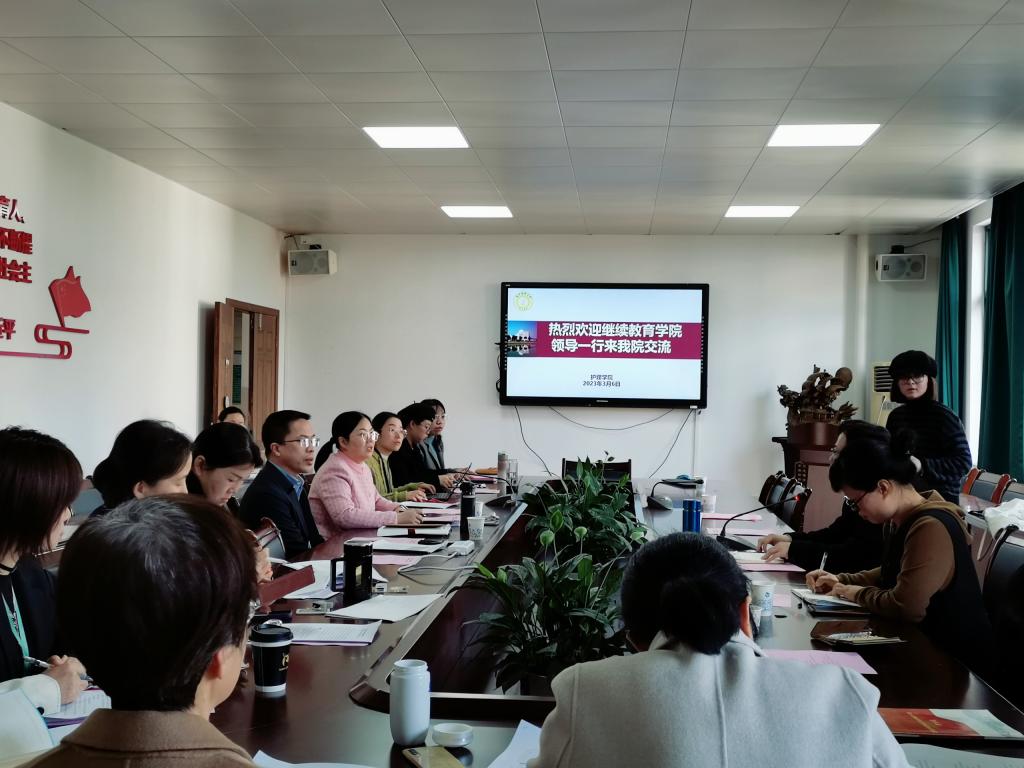 3月6日下午,继续教育av在线看 院长王世泽、副院长邵凯隽以及教务教学科室相关负责人来av在线看 讨论交流。av在线看 院长蔡福满、分管教学副院长杨晔琴、各教研室主任、课程授课老师、教学管理人员参加了交流会。交流会由杨晔琴主持。