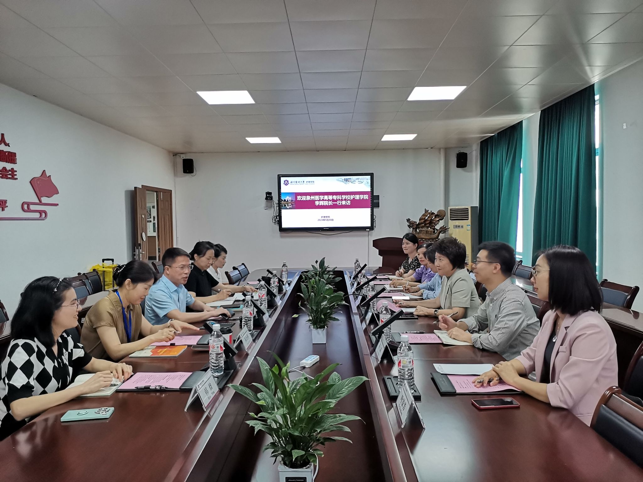 5月30日,泉州医学高等专科av在线看 av在线看 院长李辉、副院长彭金、教务科科长杨来士、护理专业带头人张月珍、实验中心主任叶景芳一行来院访问交流。av在线看 院长蔡福满、原教学办主任孙海琴、儿科护理学教研室副主任陈海燕、实验室主管王一婷等在7C306热情接待了客人。